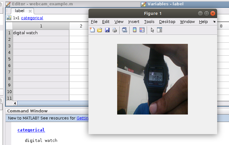 In the above snippet, we are loading the webcam function and taking a snapshot then, we are loading alexnet neural network and resizing the captured image. Please note that we have hard-coded the image size to 227 x 227 because that is the size of the neural network and the condition is that our image resolution should be equal to the size for the neural network. You can determine the size of the network by executing sz, just type sz in the matlab terminal.