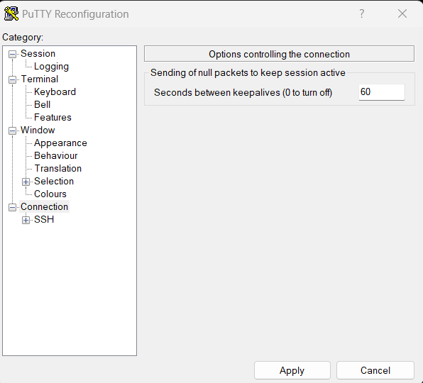 If you are using Putty as your client, then we need to set a time interval (60 seconds in example below) in order to keep the session alive. This will keep the session alive by poking it every 60 seconds.